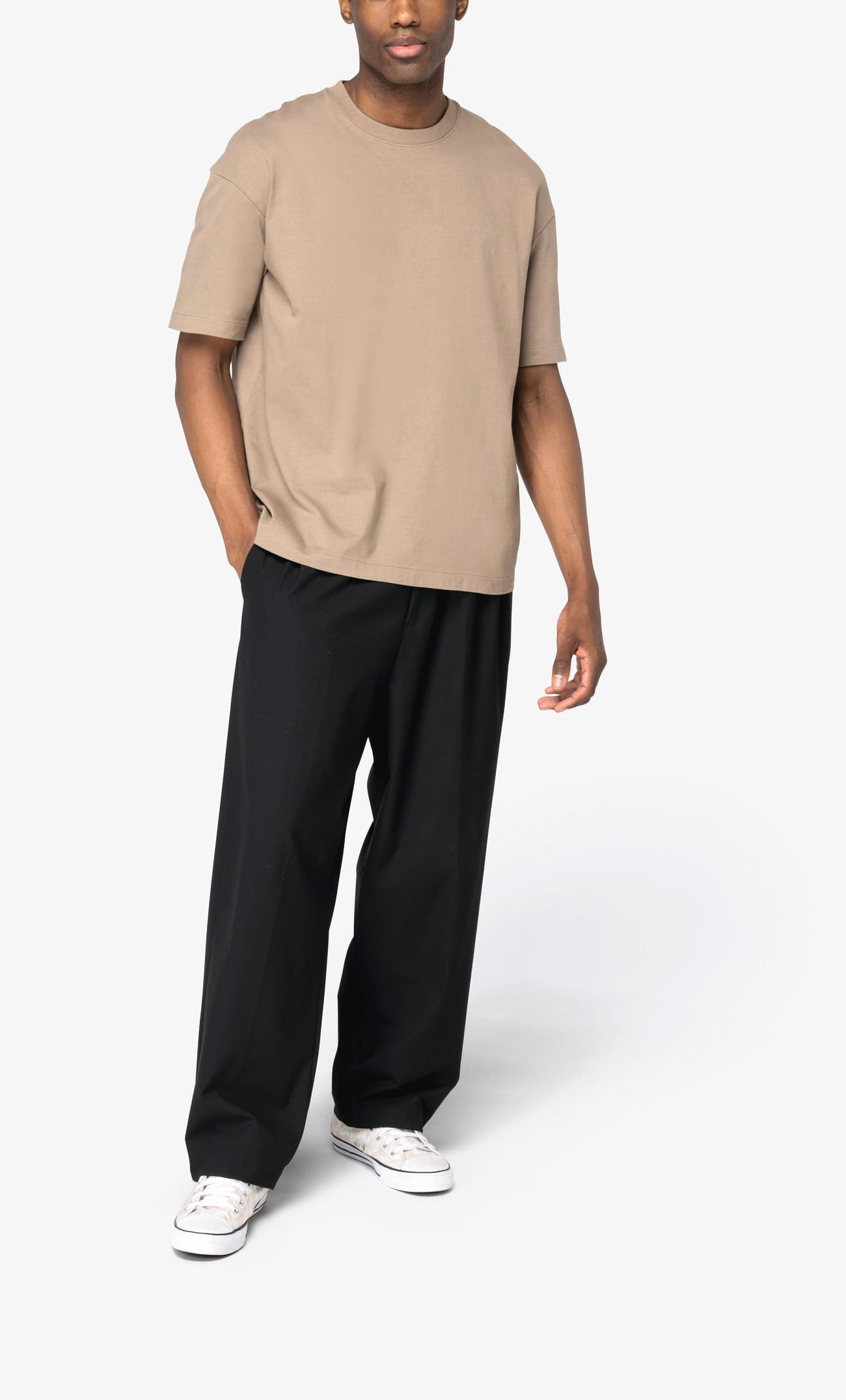100% cotone biologico cardato. Taglio OVERSIZE. Cuciture laterali. Tocco leggermente “ruvido” al tatto. Collo a costine. Nastrino di rinforzo nel tessuto principale all’interno del collo. Finitura a impuntura semplice a fondo manica e fondo capo.